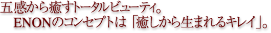 お客様への真心あふれるおもてなしと、居心地の良さをお届けするトータルビューティーサロンです。リラックス空間の中で、心温かにくつろげるひとときをご期待ください。ENONで、お客様が経験されるもの、それは、